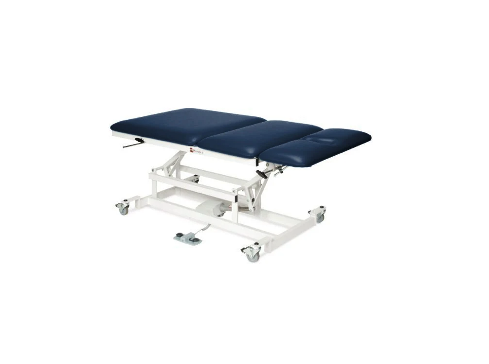 Three-piece bariatric table with a footswitch control and four total-lock swivel casters. The table is 36”W x 76”L with an adjustable height of 19” to 38”. The one-piece head section measures 15”W x 36”L and has a contoured face/nose opening while raising 45° and lowers 90°.