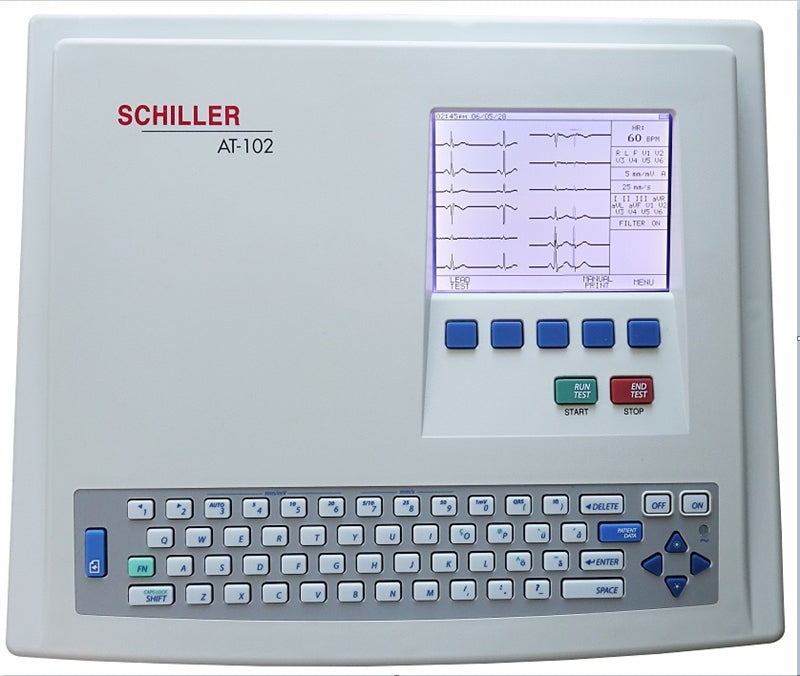 The Schiller Cardiovit AT-102 ECG (9.070000) is a reliable and efficient electrocardiogram machine with interpretation capability. This device is designed for clinical use, where the acquisition and analysis of ECG data are necessary for patient assessment.