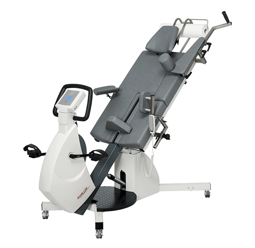 The reclining position at 45° is very comfortable. Medical exercise examinations prove that the performance in this position corresponds to the performance on a bicycle ergometer. Unlike with previous couch ergometers, the pedaling motion of the legs is now identical to the movement on a bicycle ergometer. This is due to the unique design of the pedal crankshaft. This feature eliminates all performance-related obstacles in couch-ergometry.