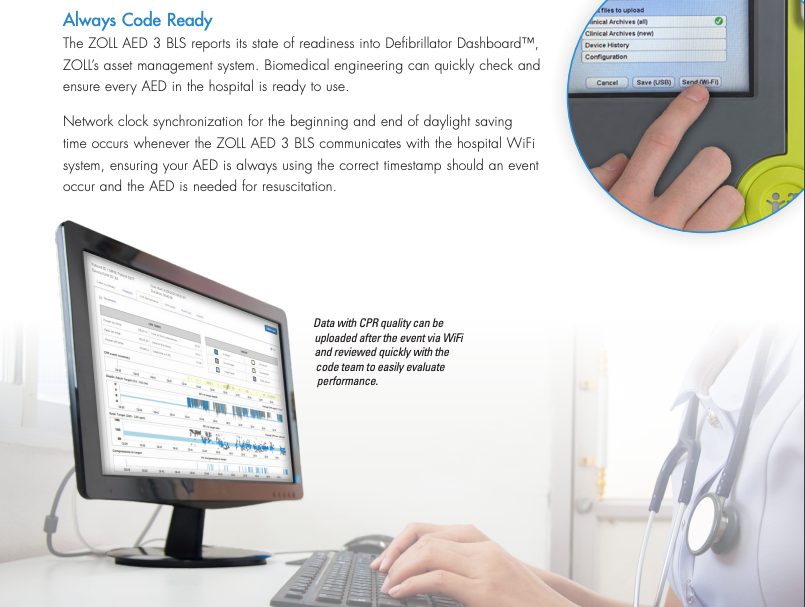 Always Code Ready: The ZOLL AED 3 BLS regularly reports its state of readiness to the Defibrillator Dashboard, ZOLL’s asset management system. This allows biomedical engineering teams to quickly check and ensure every AED in the hospital is ready to use.